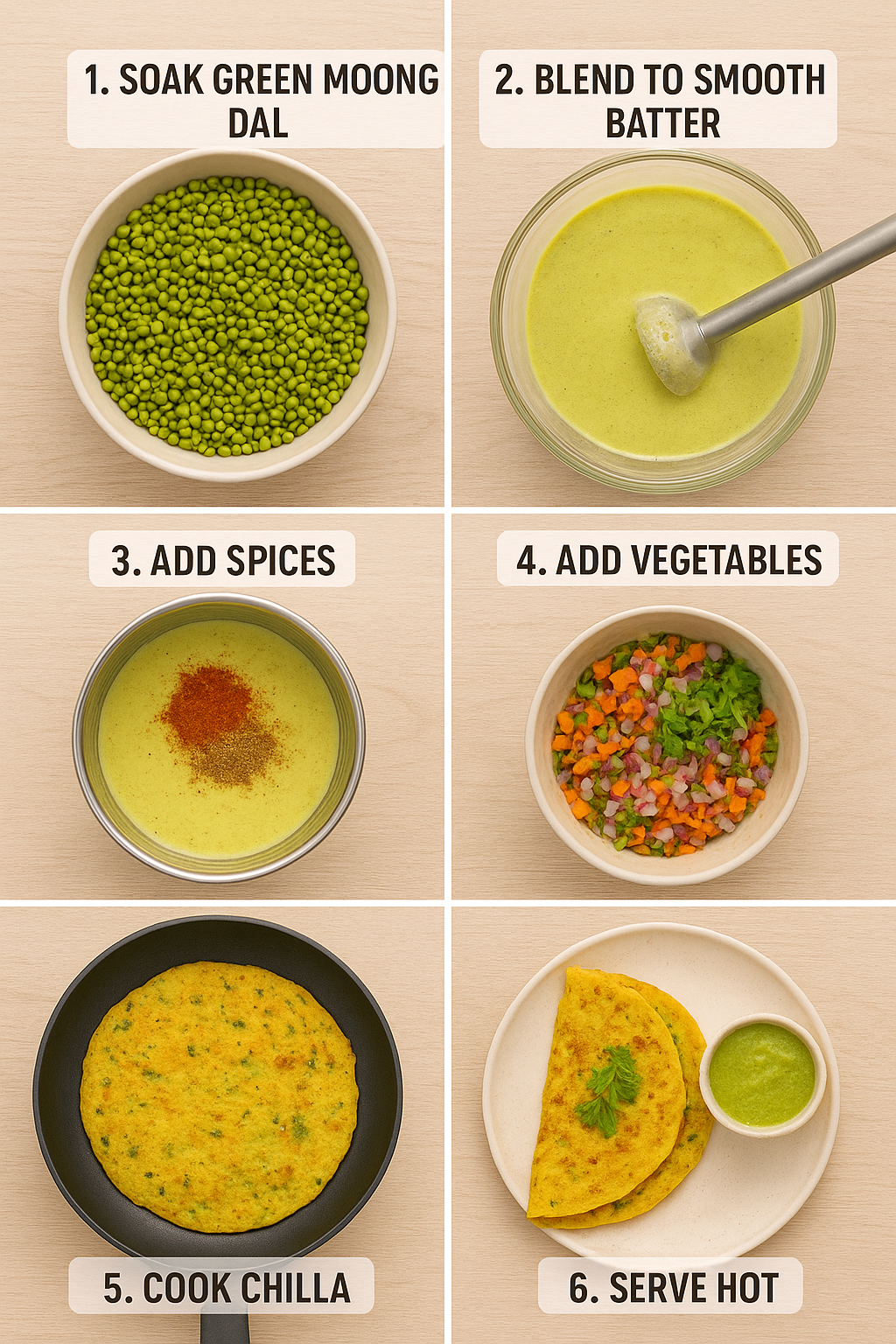 Wash and soak green moong dal in water for 4–6 hours (or overnight).