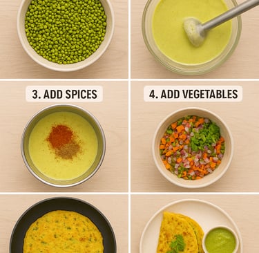 Moong Dal Chila (also called Moong Dal Cheela or Pesarattu in South India) is a savory Indian pancake made from ground moong lentils (split or whole). It’s a popular breakfast or light meal, often filled with vegetables or paneer and served with chutney. Health Benefits High in Protein: Moong dal is a plant-based protein source, great for muscle repair and vegetarians seeking protein alternatives. Low in Calories and Fat: It’s light yet filling, making it ideal for weight management. Rich in Fiber: Aids digestion, improves gut health, and helps regulate blood sugar. Gluten-Free: Naturally suitable for people with gluten intolerance or celiac disease. Packed with Nutrients: Provides iron, potassium, magnesium, and B vitamins — boosting energy and metabolism. Promotes Heart Health: Moong dal helps lower LDL cholesterol and supports cardiovascular health. Good for Detox: Its cooling nature and easy digestibility make it suitable for detox diets or light fasting days. Historical Background Ancient Roots: Moong dal has been cultivated in India for over 4,000 years. References to mudga (moong) appear in ancient Ayurvedic texts like the Charaka Samhita, where it’s described as light, cooling, and tridoshic (balancing all three doshas). Regional Variations: North India: Known as Moong Dal Chila, often stuffed with spiced paneer or vegetables. South India: Known as Pesarattu in Andhra Pradesh, made from whole green moong beans and typically served with ginger chutney. Ayurvedic Tradition: Ayurveda promotes moong dal dishes for detox and recovery diets because they are satvik (pure) and easy on digestion.
