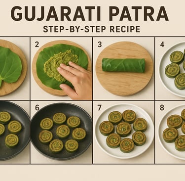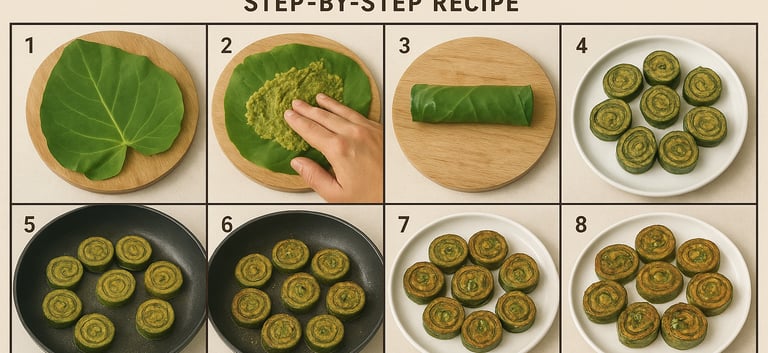 A delicious Gujarati snack made from colocasia (arbi) leaves coated with a spiced gram flour (besan) paste, then rolled, steamed, sliced, and tempered.